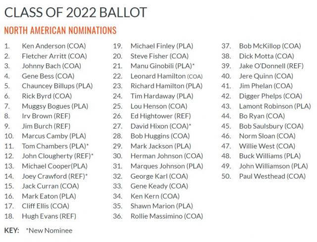 Cada uno de ellos terminaron su trayectoria ante del inicio de la campaña 18-19, por ende, están habilitados para ser parte de la lista preliminar, ya que se pide un mínimo de cuatro temporadas como retirados, algo en el cual ingresa justo Ginobili. Otros de los reconocidos jugadores son Michael Finley, Chauncey Billups, Richard Hamilton y Shawn Marion.